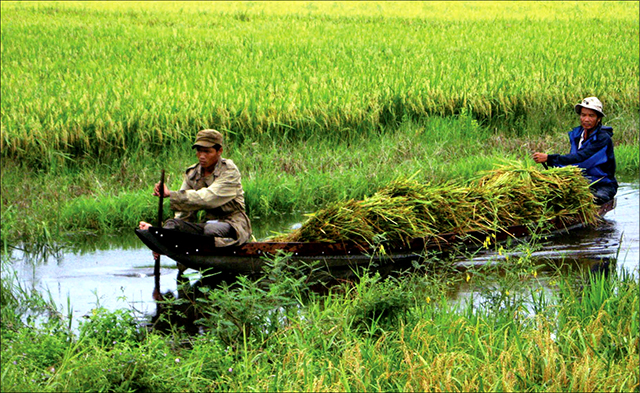 Các xứ đồng thấp ở Vinh Hà, Vinh An (Phú Vang) bị ngập, người dân tranh thủ gặt lúa