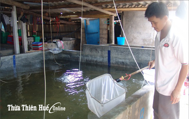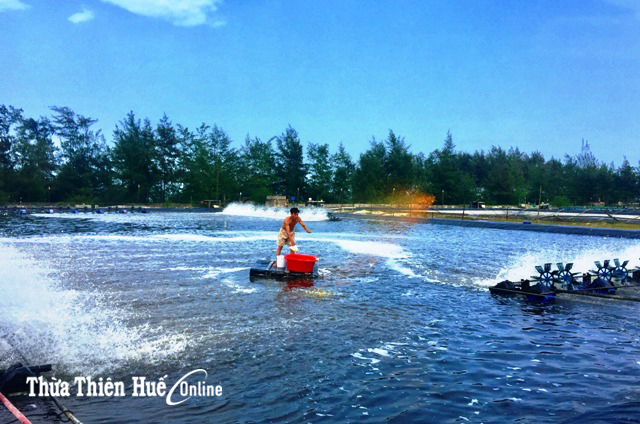 Người dân xã Phong Hải (huyện Phong Điền) chăm sóc tôm