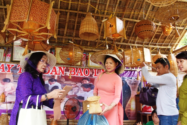 Du khách tham quan gian hàng mây tre đan Bao La (Quảng Điền) trong một dịp quảng bá sản phẩm