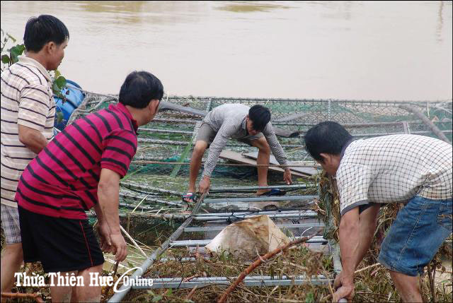 Tại Quảng Phú (Quảng Điền), người dân cũng đang khẩn trương sửa chữa, vệ sinh lồng bè sau lũ, chuẩn bị cho vụ nuôi mới. Điều người dân lo lắng là vấn đề ô nhiễm môi trường nuôi sau lũ. Hiện, người dân đang tranh thủ thời tiết thuận lợi để đồng loạt xử lý vôi, tẩy rửa, vệ sinh lồng bè. Những lồng bị hư hỏng, xiêu vẹo được gia cố, sửa chữa lại việc tái sản xuất.