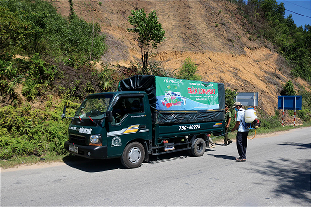 Trên Tỉnh lộ 14B, ngay điểm bước vào cửa ngõ huyện Nam Đông, 1 điểm chốt được thành lập. Cách bảng thông báo có điểm chốt chừng 2m, vôi được rải trắng trên tuyến. Cách vạch vôi chừng 250m, xe chúng tôi được lực lượng công an yêu cầu dừng lại. Biết xe từ Huế di chuyển lên Nam Đông, chúng tôi được yêu cầu mở cốp kiểm tra và phun hóa chất. Sau khi không phát hiện vận chuyển lợn, lực lượng công an ra hiệu cho xe đi tiếp.