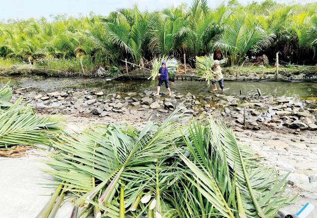 Người dân Quảng Lợi thu hoạch lá dừa nước