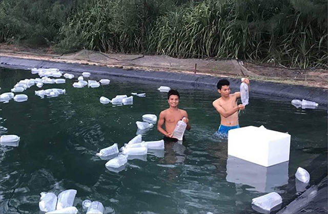 Tôm trước khi thả nuôi phải đưa xuống ao hồ để cân bằng nhiệt độ