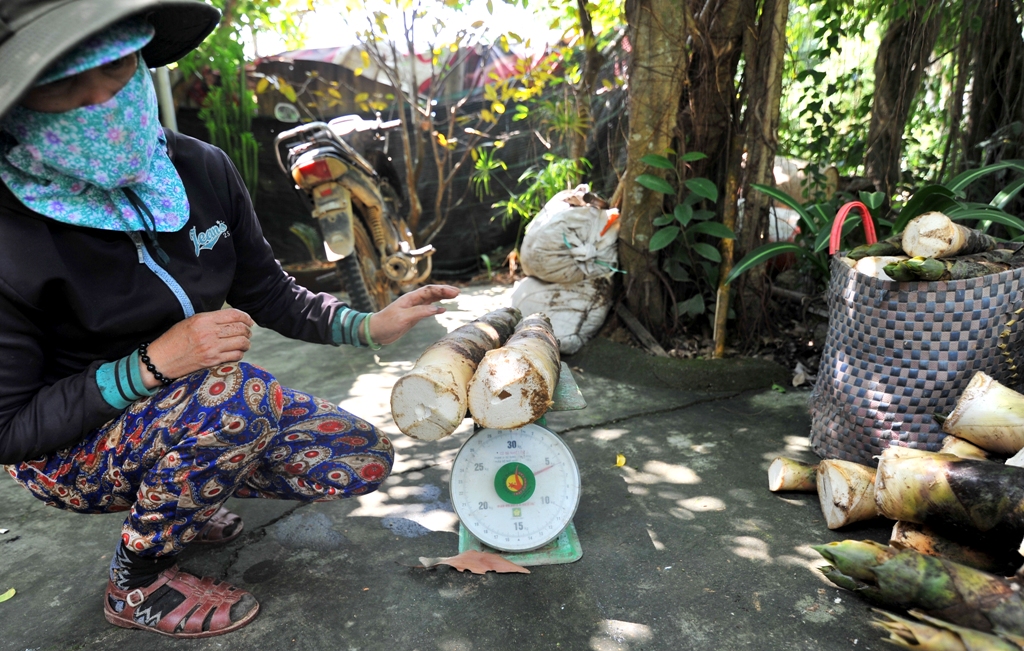 "Trung bình mỗi bụi tre cho 2-3 mụt măng, cá biệt có bụi 5 mụt, mỗi mụt từ 1-3kg, cứ bẻ xong thì tuần sau lại đến bẻ tiếp. Đến tháng 4 hằng năm, khi bẻ thì trừa lại 1 mụt măng đẹp để làm giống, 5 tháng sau mụt măng thành cây tre lớn, sau đó lại tiếp tục ra măng. Nói chung cây tre cho măng cả đời. Vào mùa, măng giá 6-7 ngàn đồng/kg nhưng vào tầm tháng 1-3, giá từ 10-15 ngàn đồng/kg tùy loại măng", ông Lam nói.
