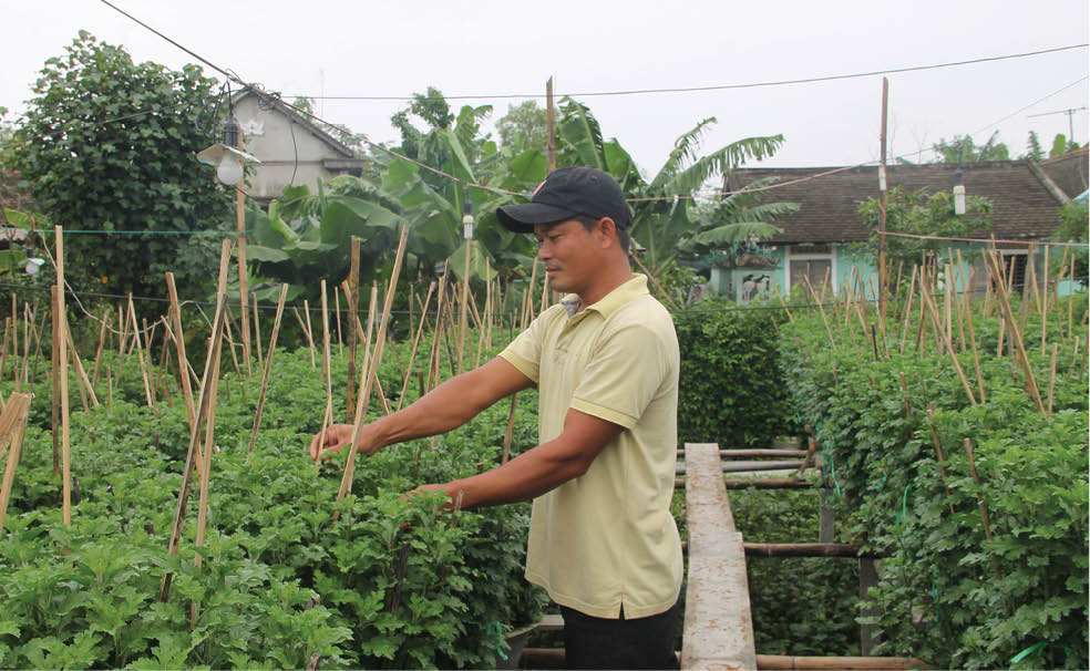 Để đảm bảo hoa cúc sinh trưởng, phát triển ổn định, anh Lợi đã chủ động dựng giàn chống lũ với diện tích 300m2. “Giàn cao 1,5m, đủ sức chống lũ. Từ đó mình yên tâm hơn khi trồng hoa, không còn lo hoa úng ngập, thối hỏng như những năm trước”, anh Lợi phấn khởi. Với giá loại cúc chậu to là một triệu đồng/cặp, cúc loại nhỏ 200 nghìn đồng/cặp, thu nhập từ hoa của anh hằng năm xấp xỉ 80 triệu đồng. Ngoài ra, anh còn canh tác một mẫu ruộng, nuôi đàn bò 14 con, kinh tế ngày càng ổn định.