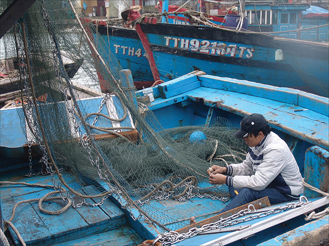 Ngư dân Vinh Thanh vá lại lưới sau khi bị tàu giã cào phá hoại