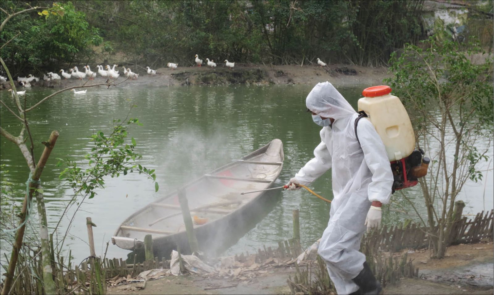 Cán bộ thú y phun thuốc tiêu độc khử trùng tại trại chăn nuôi gia cầm ở xã Quảng Phú