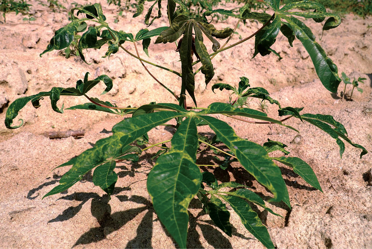 Cây sắn nhiễm bệnh khảm lá với đặc tính mặt lá bị quăn, vàng loang lổ