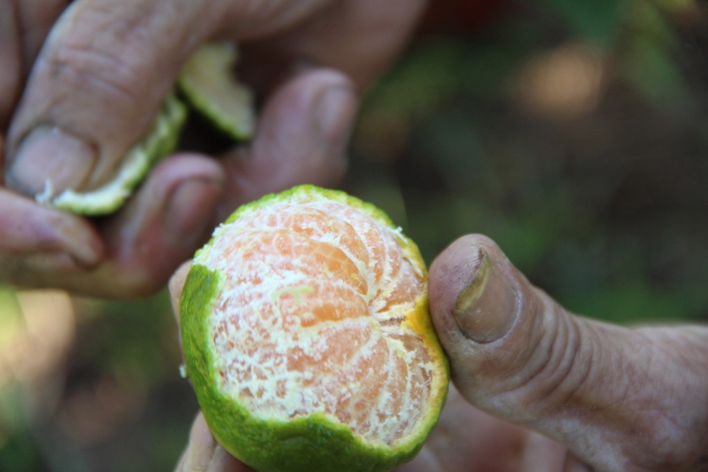 Một trái quýt Hương Cần sau khi được bóc vỏ ngay tại vườn rất ấn tượng