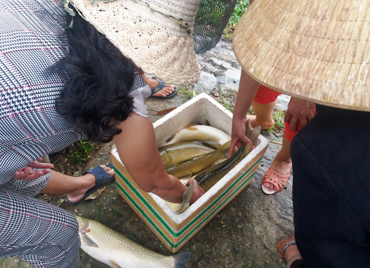 Cá trắm cỏ có trọng lượng 2,5-4kg tại xã Quảng Thọ chết vì ngạt ô xy sau bão số 5