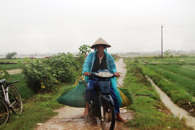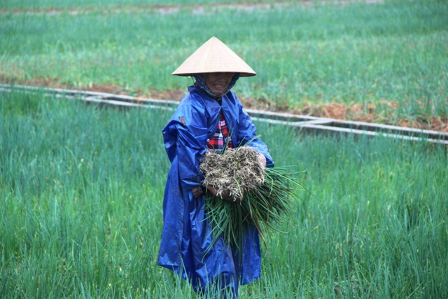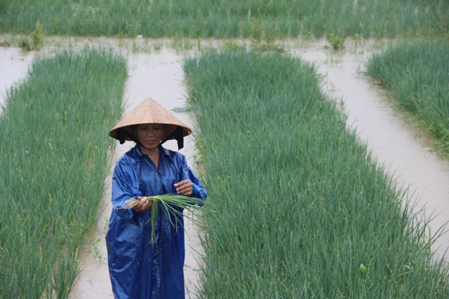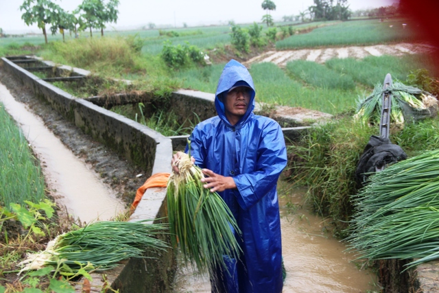 Tại xứ đồng Chùa, phường Hương An, hàng chục ha hành cũng bị ngập úng, bật ra khỏi luống, nhiều diện tích bị mất trắng. Bà con đang thu hoạch non số hành bị ngập, đổ gốc. Anh Hồ Văn Nhớ (thôn Cổ Bưu, xã Hương An) lo lắng: “Vụ này tui trồng 2,5 sào, mưa lớn trong 2 ngày làm 1,5 sào mất trắng. Số diện tích khác phải nhổ trồng lại nếu trời nắng, nhưng gặp mưa thì không “cứu” được. Thời điểm giá cao, hành bán 10 nghìn/kg, hiện do nhổ hành non, bà con bán nhiều nên giá rất thấp”.