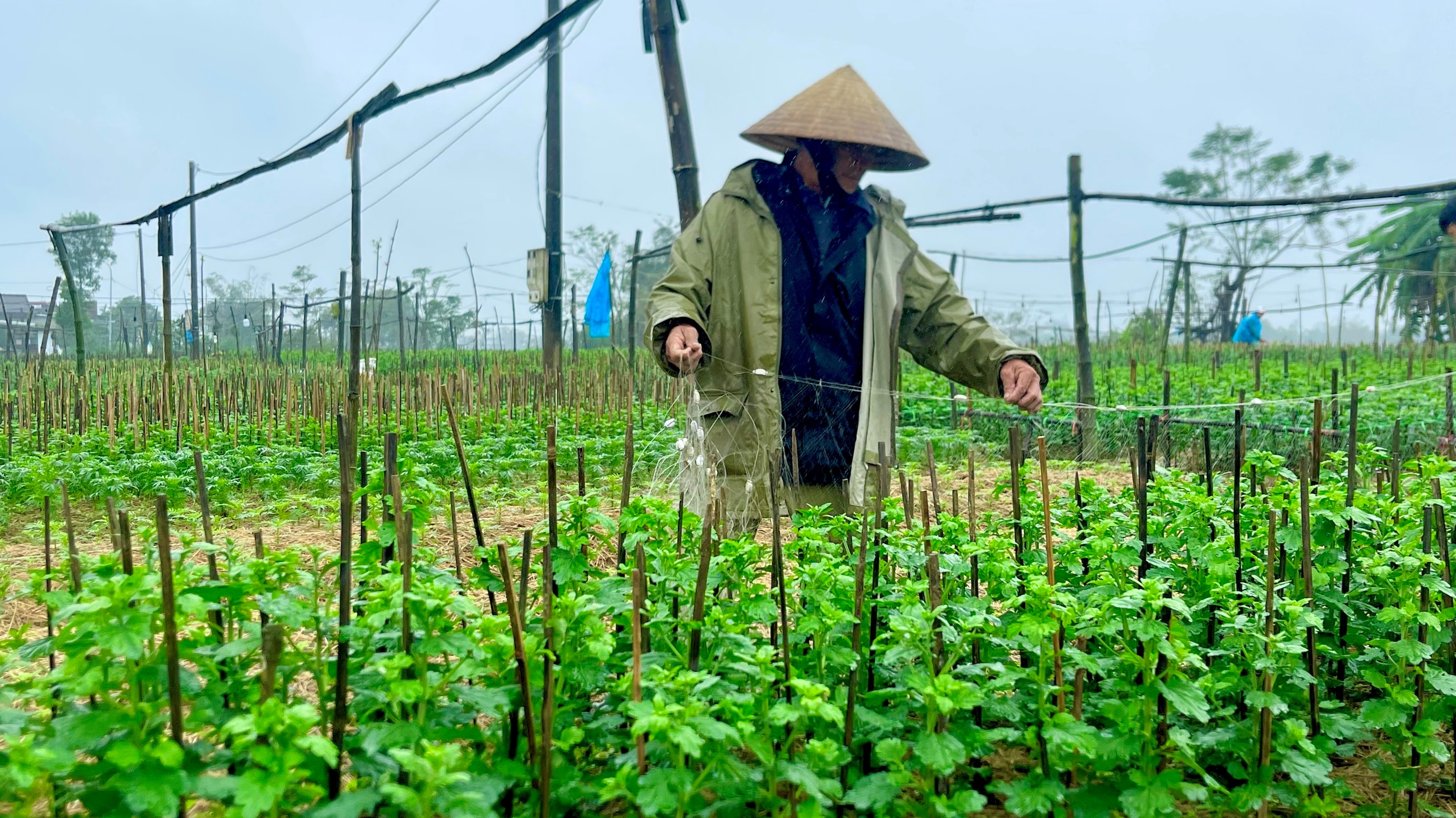 Dưới tiết trời mưa lạnh của những ngày cuối năm, nông dân làng hoa Phú Mậu vẫn miệt mài khom lưng chăm sóc từng luống hoa, để hi vọng có nhiều bông hoa đẹp, đạt chất lượng trong dịp tết Nguyên Đán sắp tới.