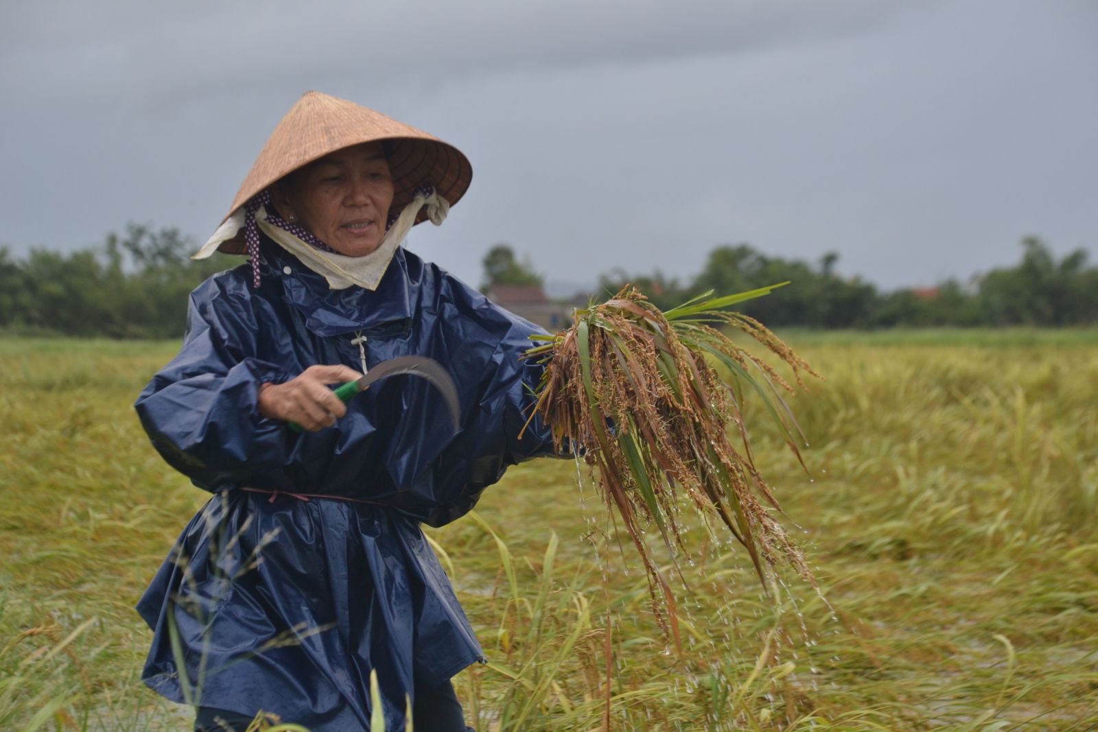 Chính quyền địa phương đang lắp đặt các trạm bơm để tiêu úng và tiến hành gặt tay, diện tích nào gặt máy được phải tận dụng gặt ngay.