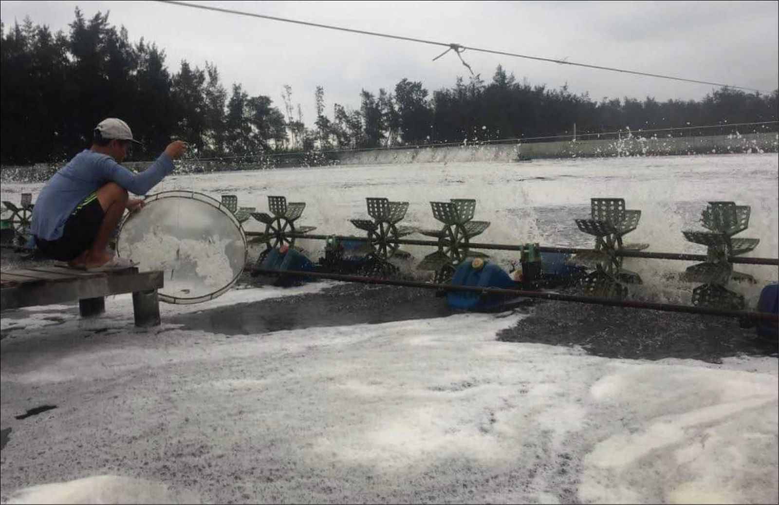 Người dân kiểm tra tôm sau khi thả giống vụ chính