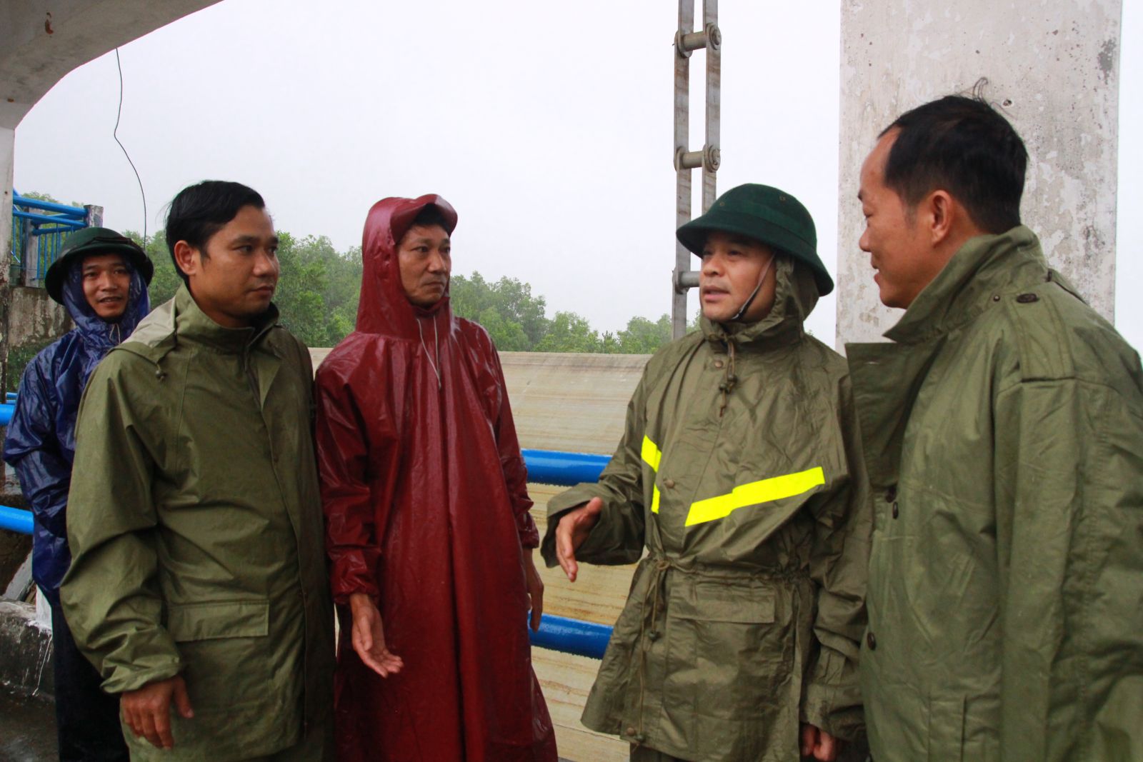 Phó Bí thư Tỉnh ủy Nguyễn Quốc Đoàn (thứ 2 từ phải qua) chỉ đạo cần thực hiện nghiêm túc việc ứng trực, đảm bảo an toàn công trình thủy lợi hồ Truồi