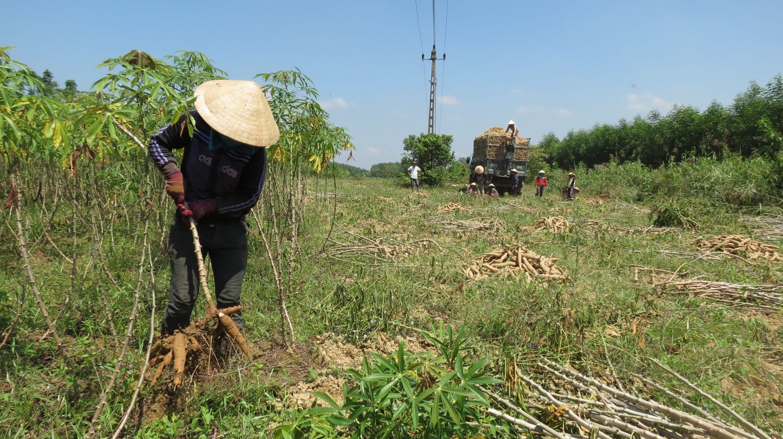 Người dân xã Phong Mỹ vận chuyển sắn lên xe đi tiêu thụ