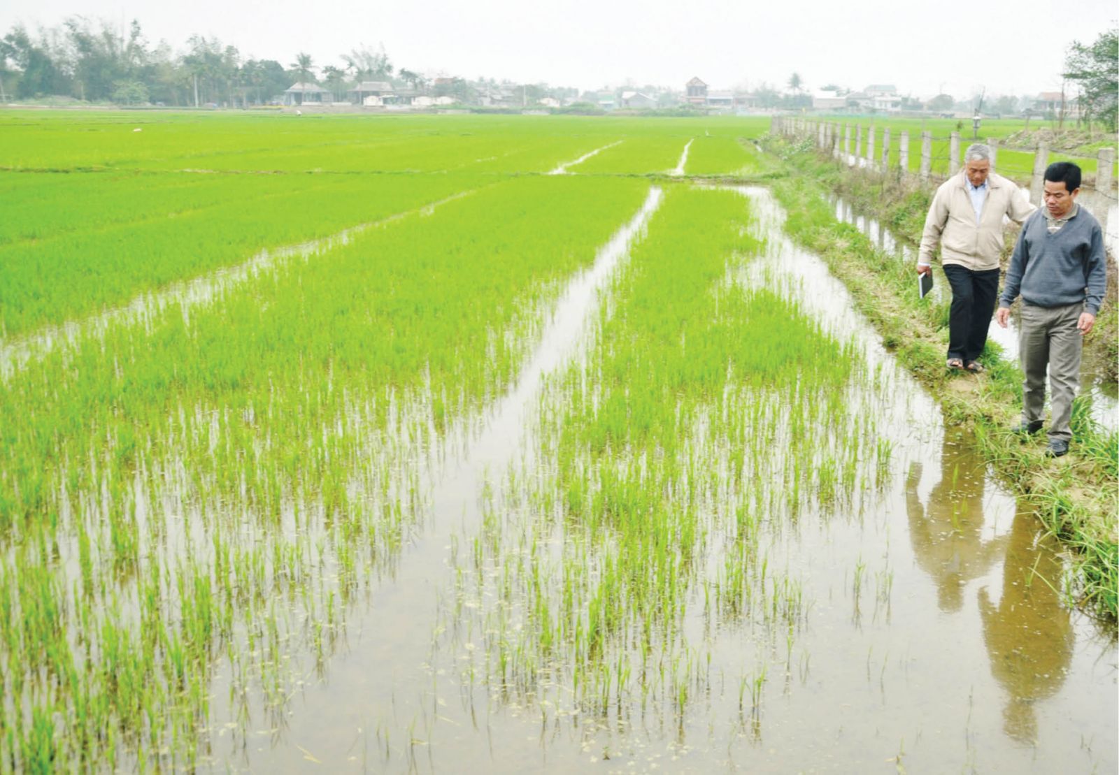 HTX đang hướng dẫn các đội sản xuất vào nước chân ruộng để kết thúc bón thúc phân cho giai đoạn 3 đối với giống 4B với tỷ lệ phù hợp. Khâu bón đồng, điều tiết nước trong chân ruộng và phun trừ sâu bệnh đều được HTX hướng dẫn, giám sát và thông báo trên đài truyền thanh.