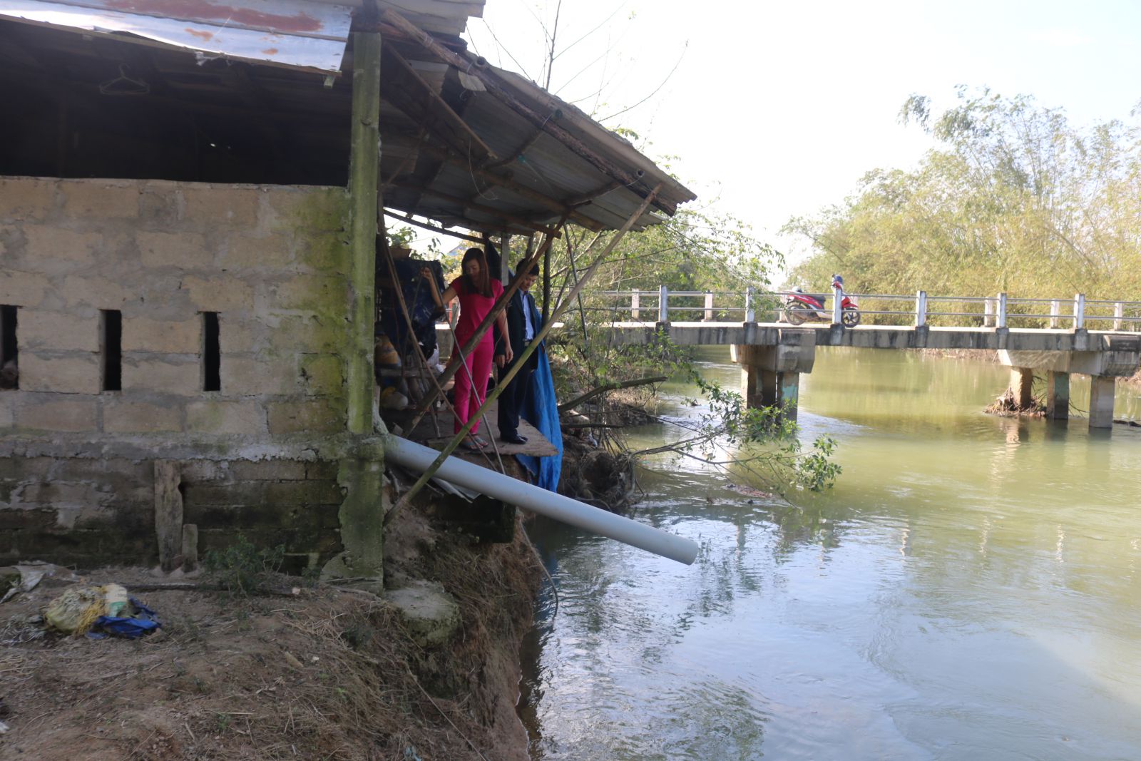 Sau 2 đợt lũ liên tục trong tháng 12/2016, nhiều diện tích đất đai, căn nhà vợ chồng chị Hoàng Thị Xuân Thủy, đội 3, thôn Phú Lương B, xã Quảng An bị uy hiếp trực tiếp. Một số điểm sạt lở đã ăn sâu sát móng nhà dân, nhiều diện tích đất, tre chống sạt lở dọc tuyến cũng bị nuốt chửng. Chị Thủy than thở: Tình trạng sạt lở mới diễn ra trong tháng 12/2016, sâu chừng 2,5m. Những ngày đầu, vợ chồng tôi đêm chẳng dám ngủ, vật nuôi trong nhà cũng phải bán tháo vì sợ hà bá nuốt mất. Ai đi ngang nhà cũng ái ngại cho hoàn cảnh của gia đình. Lúc trước, học sinh thích ngồi sát mép sông học bài giờ cũng chuyển hẳn vào sân nhà. Tôi mong Nhà nước sớm triển khai xây dựng kè dọc bờ sông, chứ tình trạng này, không biết năm sau sẽ ra sao.
