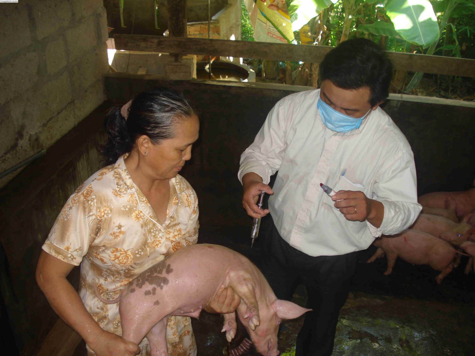 Cán bộ thú y huyện tiêm vắc xin cho lợn