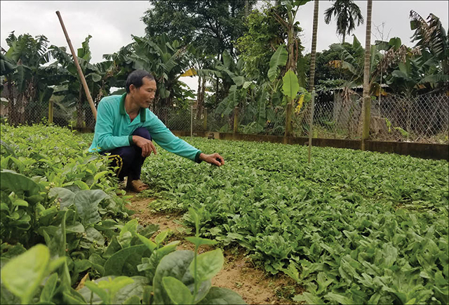Ông Cao Ngà, thôn Phước Yên nhanh tay dọn dẹp lại vườn tược. 500m2 đất vườn trồng chuối, rau ngót nhếch nhác vừa được ông khoanh vùng bằng tường, rào thép B40. Những cây trồng tạp trước đó được nhổ bỏ thay thế vào đó là loại rau. Với 500m2 vườn và 8 sào rau má, mỗi năm ông Ngà thu hơn 150 triệu đồng từ trồng rau các loại.