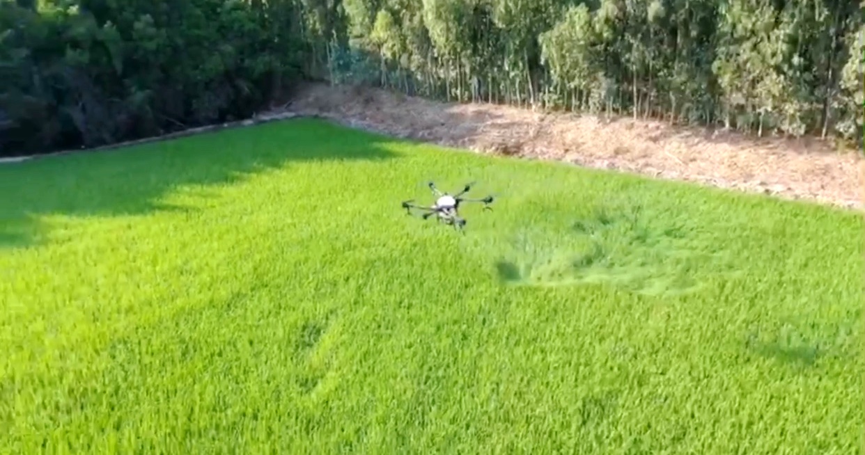 Gió xoáy từ thiết bị bay không người lái không làm lúa đổ rạp mà còn giúp thuốc thấm đều