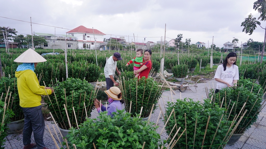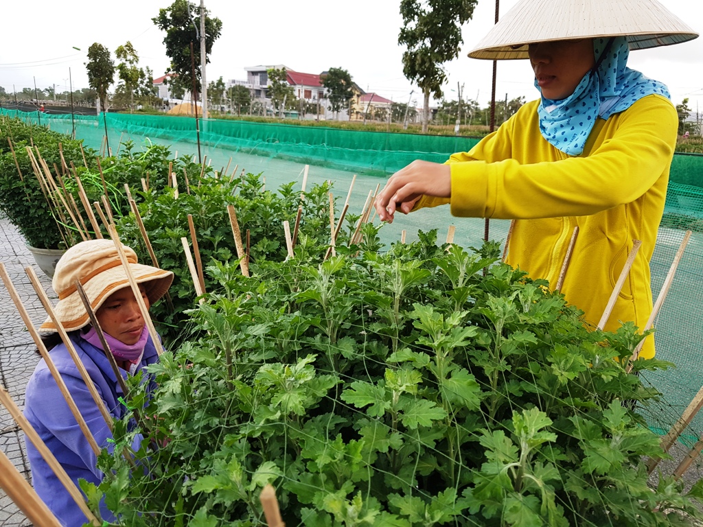 Cặm cụi cắm vè cho hơn 400 cặp hoa cúc, ông Nguyễn Văn Lớn ở vùng hoa Thủy Vân (Hương Thủy) hớn hở khi trông chờ vào một vụ hoa tết thành công. Theo kinh nghiệm gần chục năm trồng hoa cúc của ông Lớn, thời tiết năm nay thuận lợi nhất so với mọi năm, hoa phát triển tốt, ít sâu bệnh, chỉ hơi mất công cho việc tưới nước. “Năm trước tôi cũng trồng chừng ấy nhưng chỉ lãi chưa đến 30 triệu vì dịch bệnh triền miên. Nhưng năm nay thời tiết tốt hơn nhiều, nếu không có gì thay đổi, hy vọng sẽ bội thu”, ông Lớn khấp khởi.