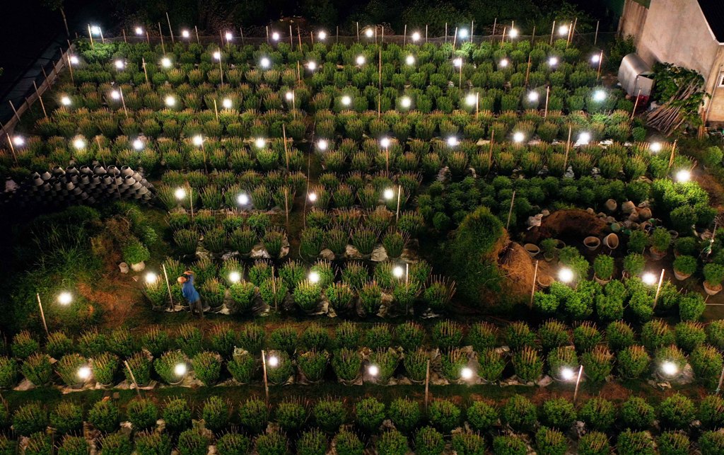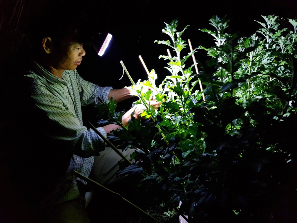 Để kịp cho hoa ra đúng dịp Tết Nguyên đán, nhiều người dân phải thức đêm, dọi đèn chăm hoa