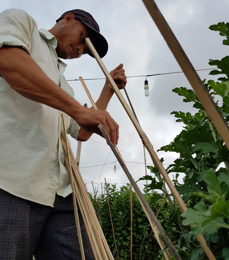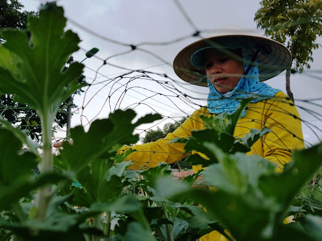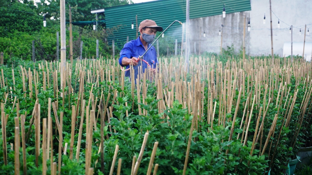 Để có được những chậu hoa ngập sắc vàng cho người chơi hoa tết, ít ai hiểu rằng người trồng phải trải qua 6 tháng thăng trầm, lo toan trước diễn biến thời tiết thất thường. Khác với mọi năm, nông dân trồng hoa cho biết năm này thời tiết khá thuận lợi, thay vào đó tăng cường tưới nước nên hoa cúc phát triển khá tốt, không có dịch bệnh. Thời điểm này, hoa đang ở giai đoạn tháng thứ 4, chuẩn bị cho nụ nên việc chăm bón vô cùng kỹ lưỡng, người trồng có mặt ở vườn gần như từ sáng đến tối.