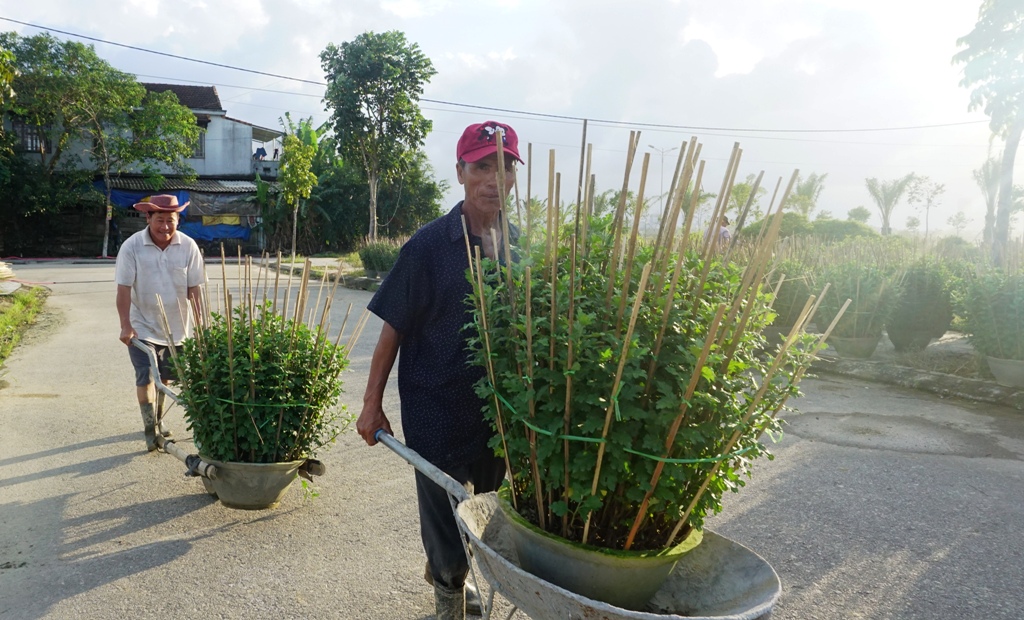 Nhiều chậu hoa ở vùng hoa Thủy Vân (Hương Thủy) sau khi được nông dân cắm vè xong, di chuyển đến nơi cao ráo
