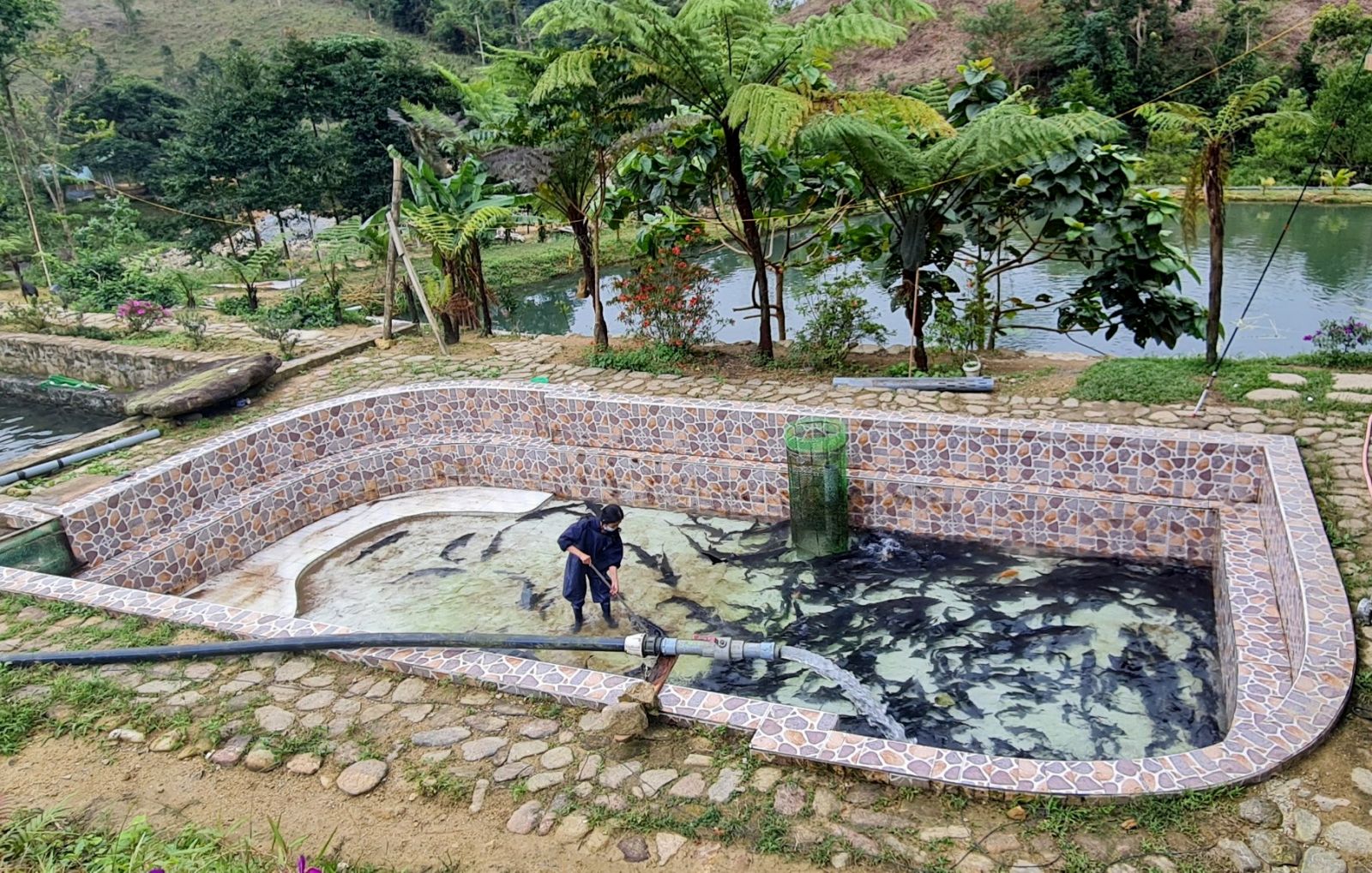 Hiện, trang trại anh Phương có 3 hồ nuôi cá tầm. Trong đó 1 hồ có 300 con đạt trọng lượng thu hoạch, 1 hồ có cá bố mẹ nặng hơn 20kg. Trên quả đồi có diện tích hơn 2 ha, ngoài nuôi cá, anh còn trồng thêm ổi, quýt, rau… đón du khách tham quan, trải nghiệm và chế biến cá tầm.