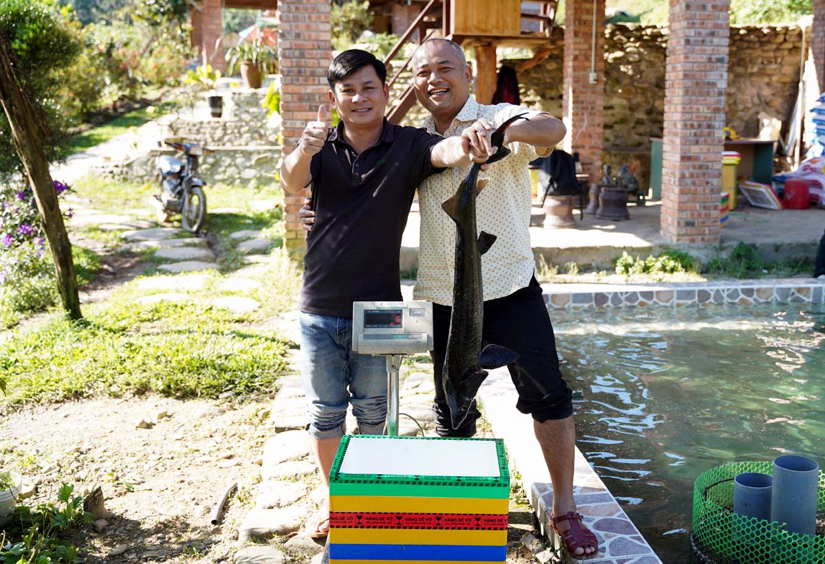 Anh Lê Viết Biên (bên trái) khoe chú cá mua về nặng gần 4kg