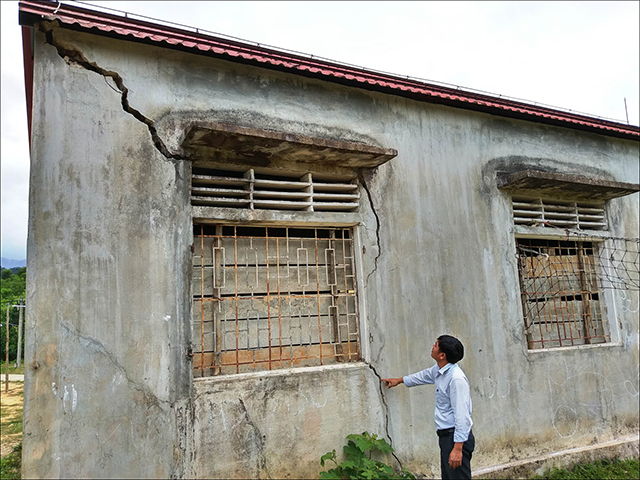 Đến khu TĐC thôn A Sáp, chúng tôi chứng kiến nhiều nhà dân cùng hệ thống đường sá bị lún, xuống cấp. Nhà văn hóa thôn A Sáp từ khi nhận bàn giao công trình đến nay chưa được sử dụng do móng nhà bị lún, tường nứt toác (vết nứt dài khoảng 2m), không đảm bảo an toàn. Hệ thống nước sạch tự chảy từ lâu cũng không sử dụng được. Đường liên thôn cũng bị trôi hết lớp bê tông, còn lại sỏi đá.