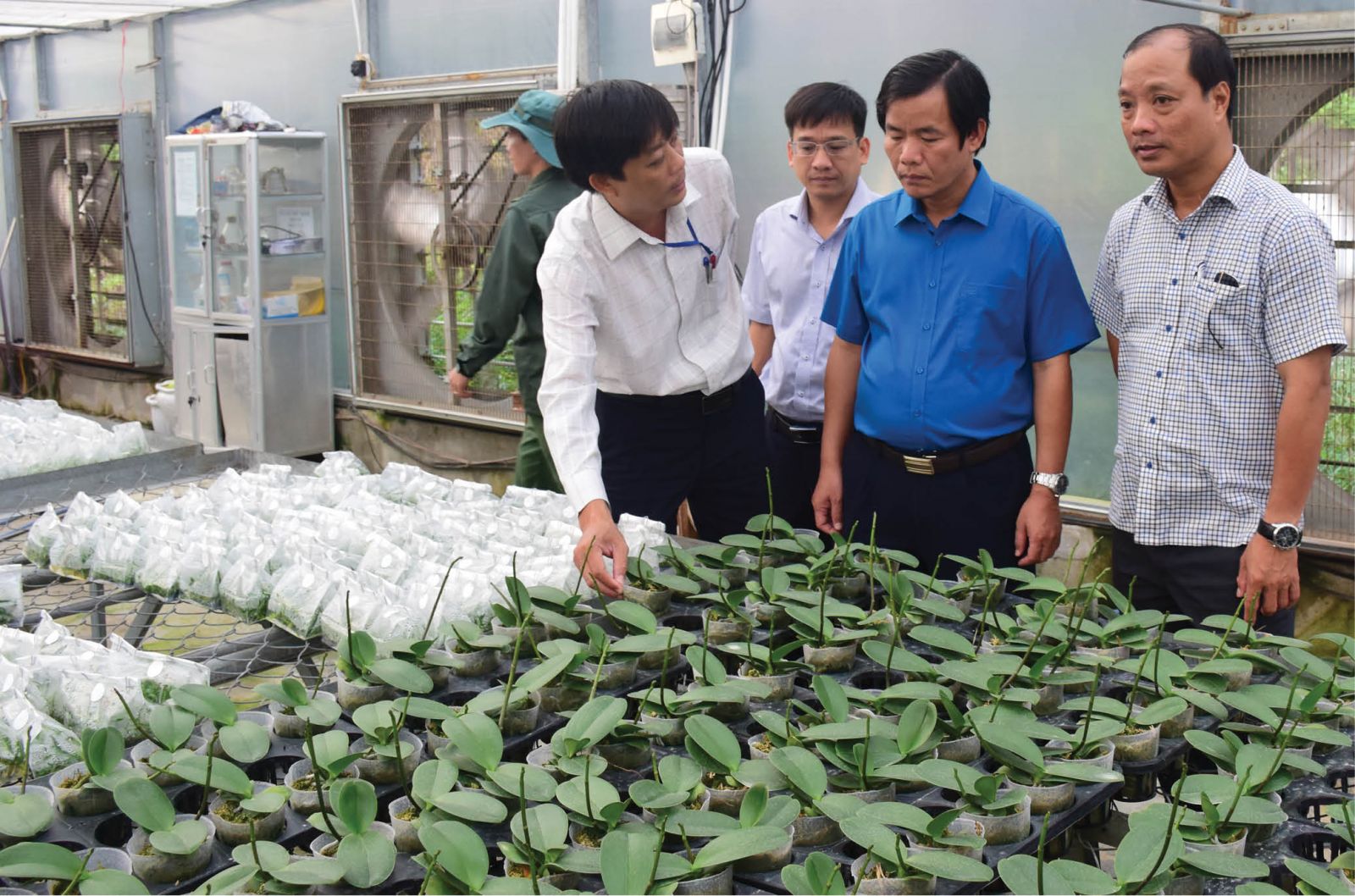 Tham gia liên kết tiêu thụ sản phẩm nông nghiệp tạo kết nối chuỗi sản xuất và tiêu thụ nông sản bền vững. Trong ảnh: Phó Chủ tịch UBND tỉnh Nguyễn Văn Phương thăm mô hình nuôi cấy lan ở Lâm trường Tiền Phong