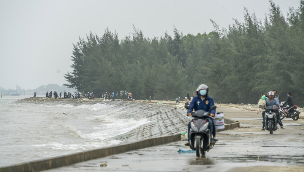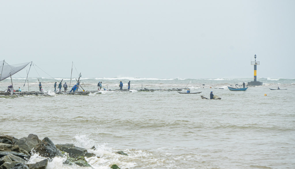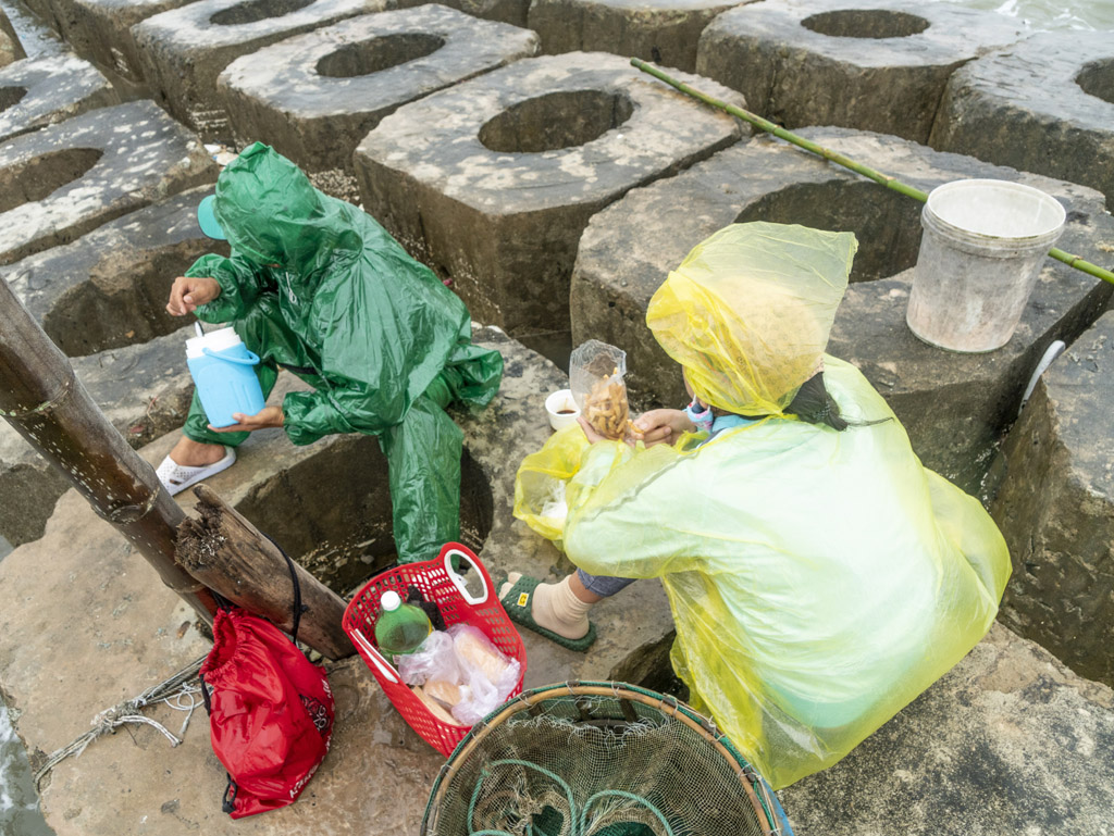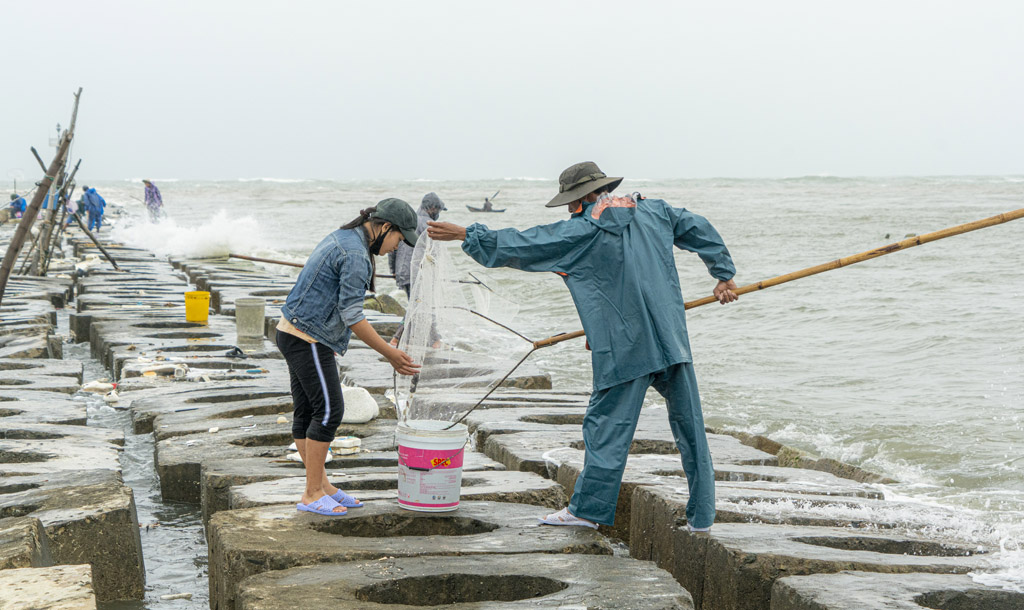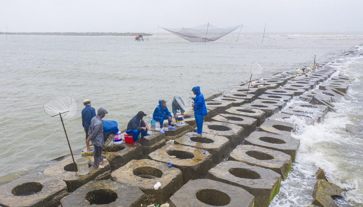 Quang cảnh các gia đình, nhóm tập trung ở chân kè chắn sóng thả lưới bắt cá rò