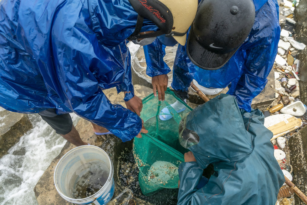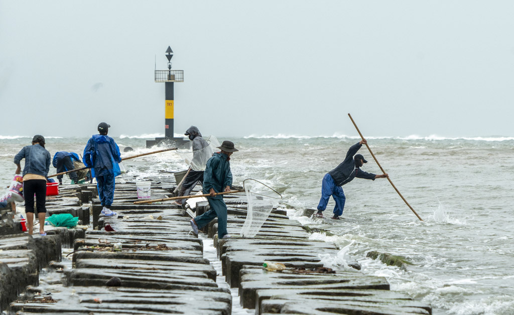 Muốn bắt cá rò bằng vợt, ngư dân phải có sức khỏe và biết cách đứng trụ tạo thế an toàn trên bờ kè