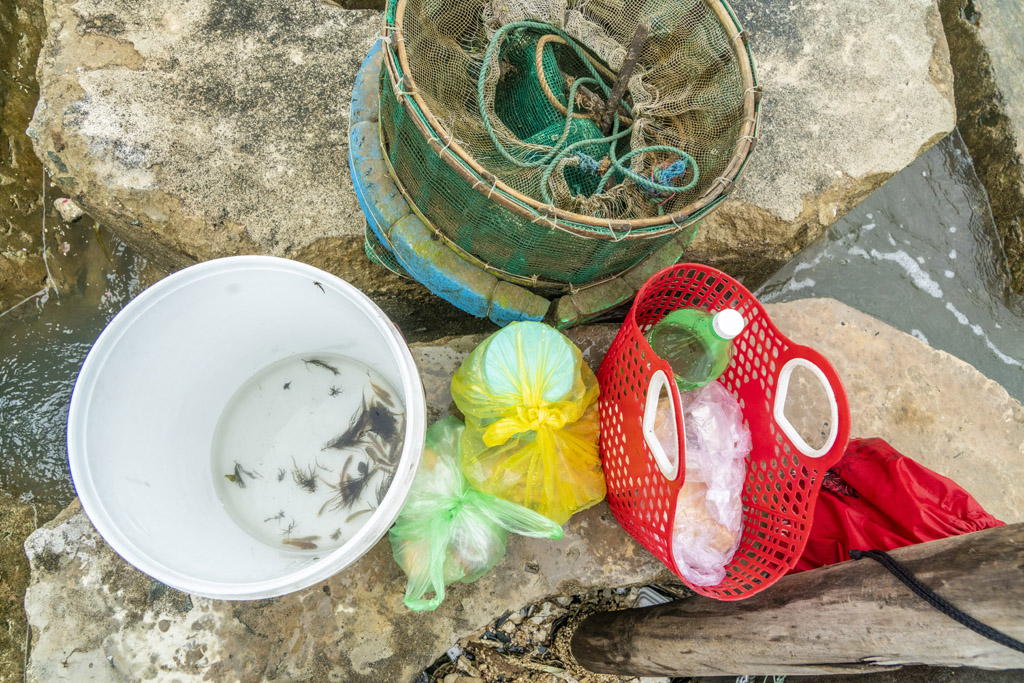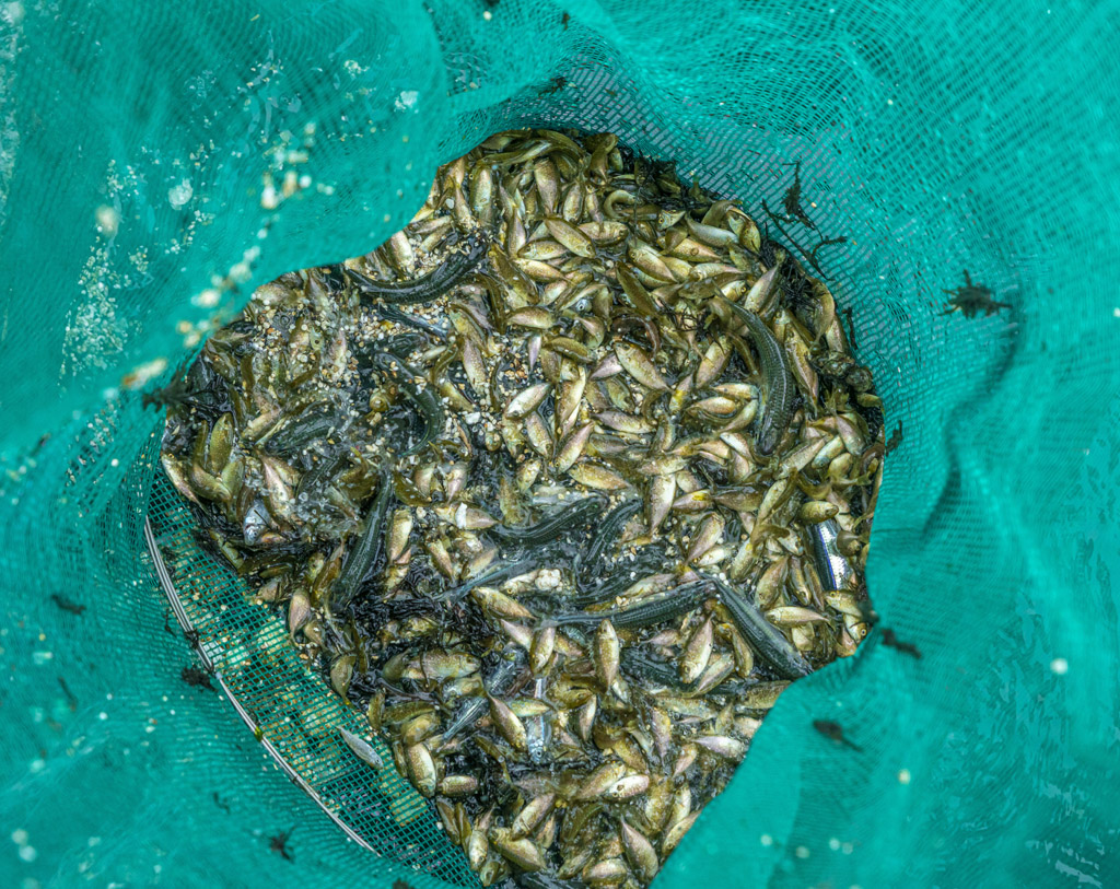 Nhiều phương tiện, dụng cụ được huy động để thu hoạch cá như lưới, vợt, đáy... và người dân có thể tự mình thu hoạch hoặc theo nhóm bạn bè, theo gia đình. Tùy theo lượng cá vào bờ ăn rong hàng ngày, mỗi người có thể thu về vài trăm nghìn đồng một ngày hoặc vài triệu đồng.