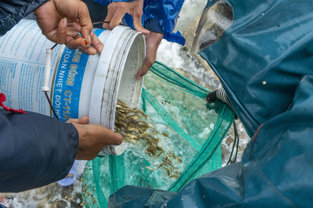Cá được thương lái thu mua theo rổ để mang về phân phối cho người nuôi. Tầm hai, ba tháng sau là có thể xuất bán cá khi đạt trọng lượng theo yêu cầu.