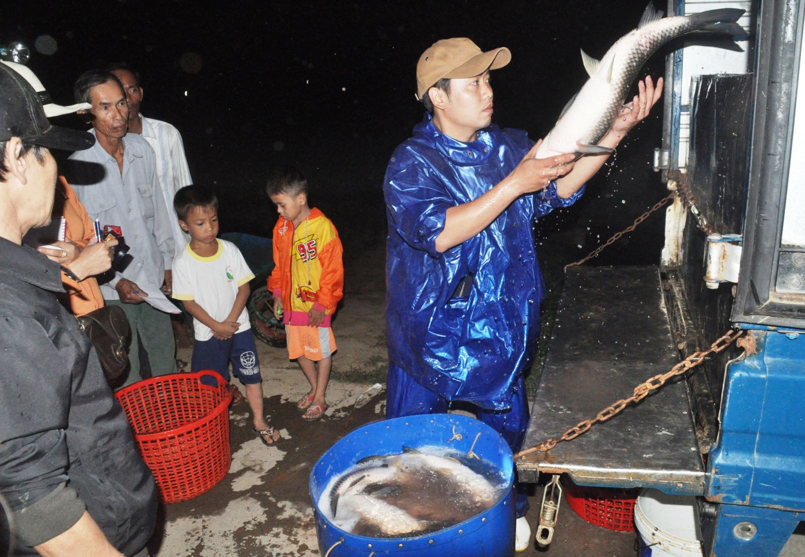 Lái buôn đến thu mua cá trắm tại xã Quảng Thọ