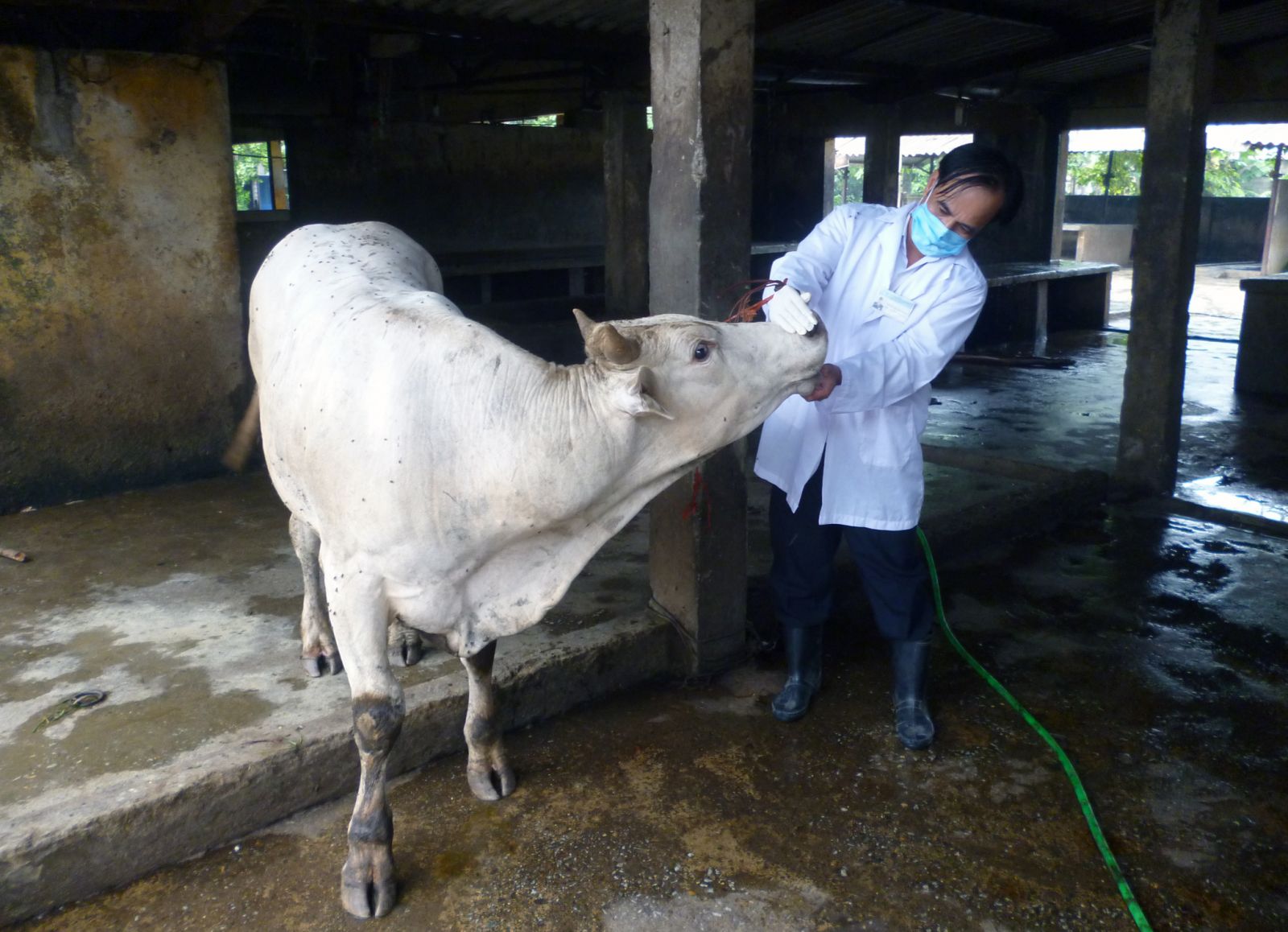 Cán bộ thú y kiểm tra bệnh lở mồm long móng