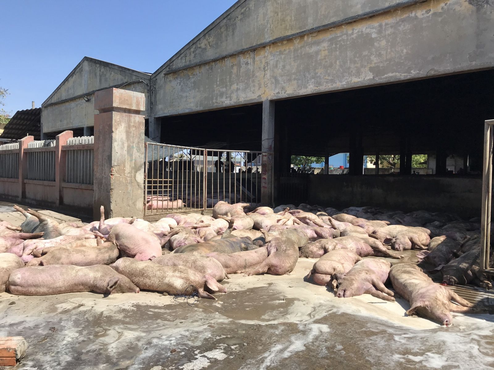 Tại hiện trường, hàng chục xác lợn nằm la liệt, một số đã trương phình và bốc mùi hôi.
