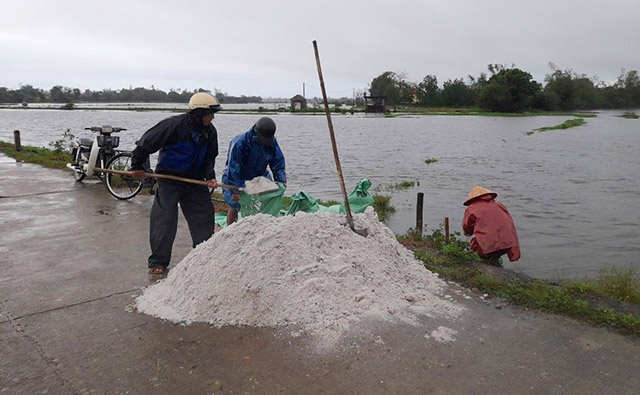 Dùng bao cát gia cố đê bao nội đồng ở Phong Điền. Ảnh: Đức Quang