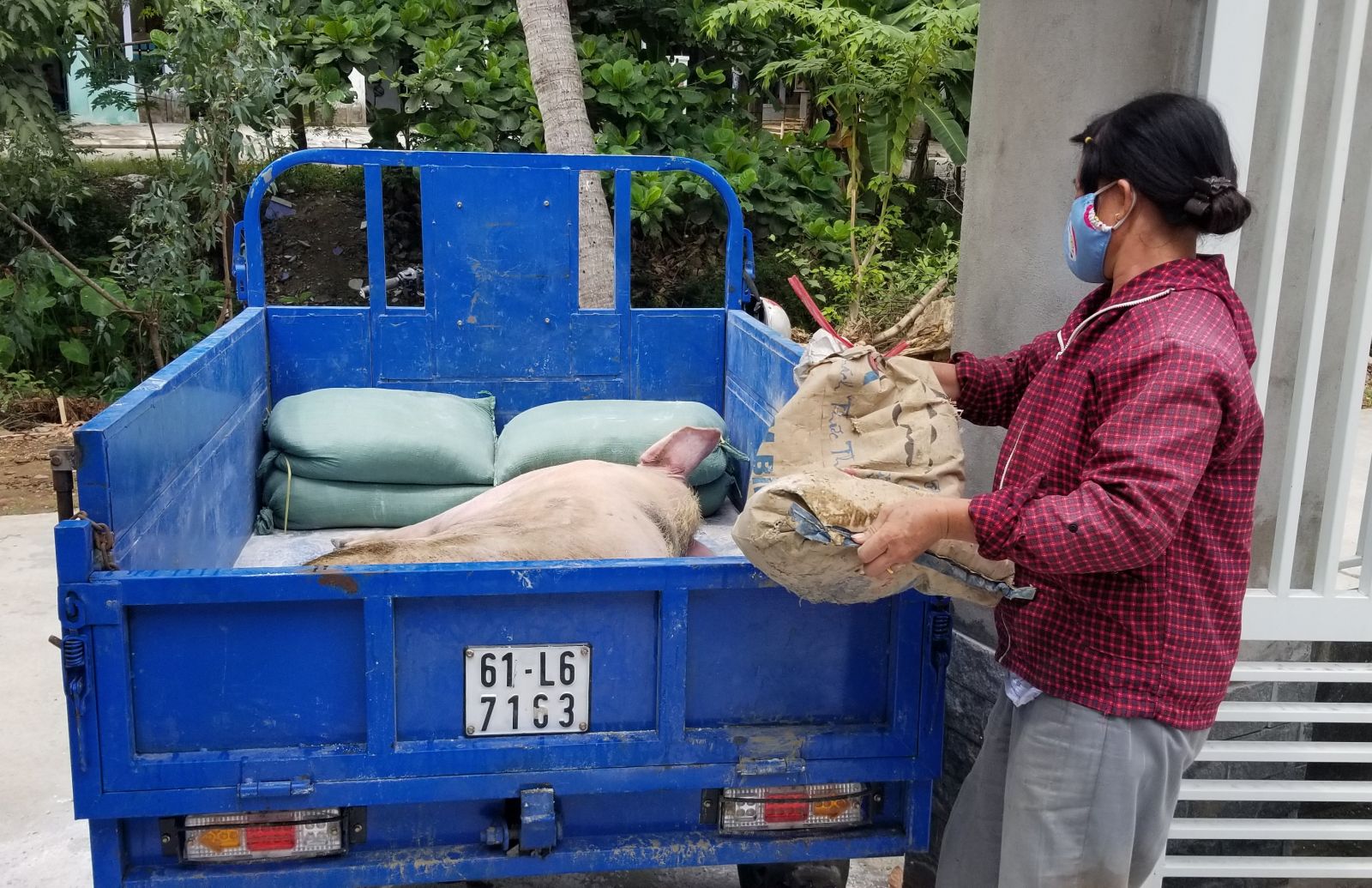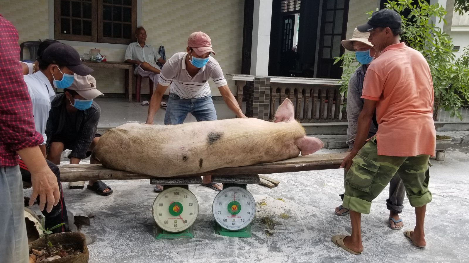 Cân lợn bị dịch tả lợn châu Phi trước khi đưa đi tiêu hủy tại hộ ông Trần May, tổ 7 phường Hương Sơ trong sáng 30/5