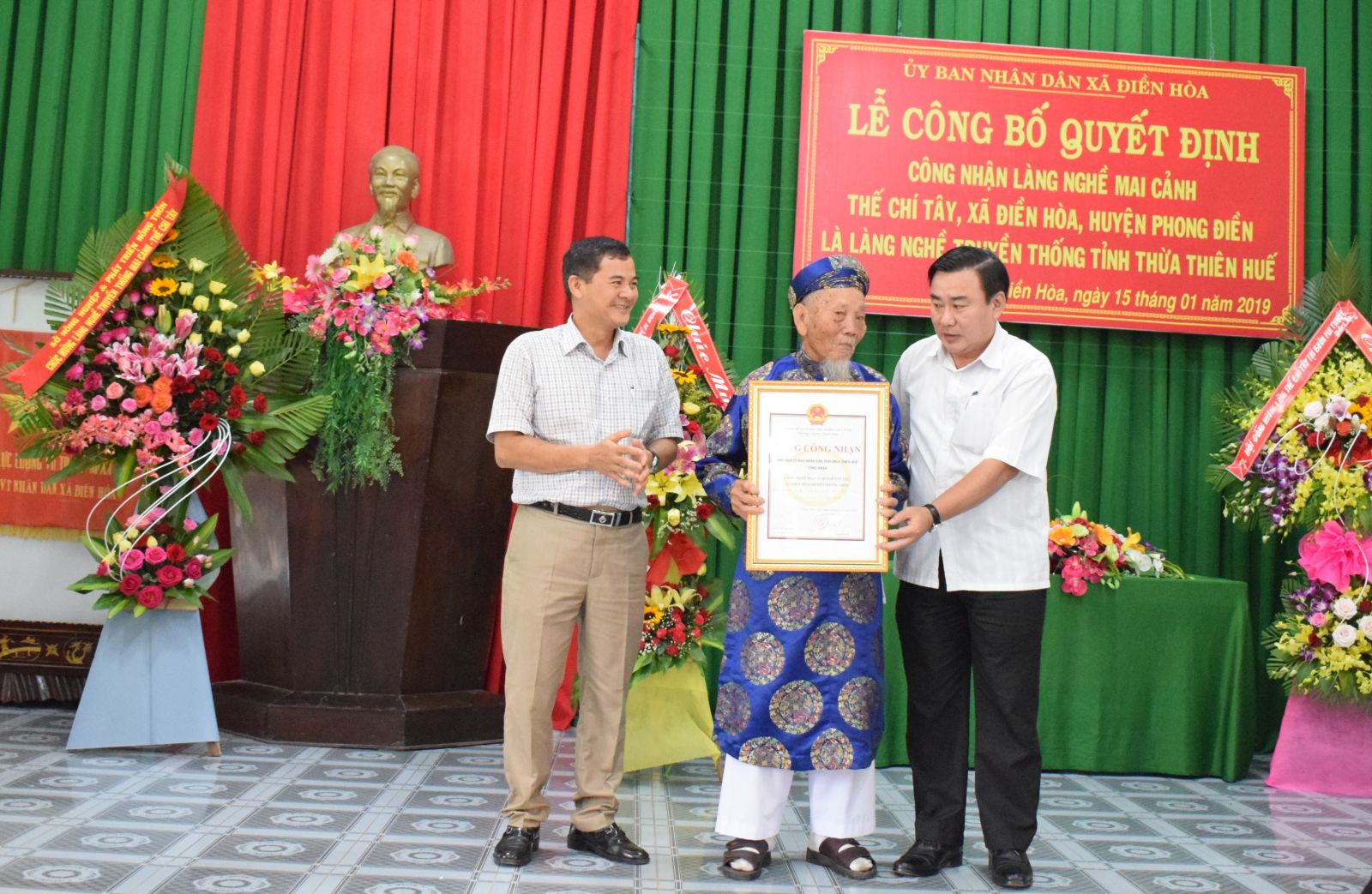 Ông Võ Văn Vui, Phó Bí thư phụ trách Đảng bộ huyện Phong Điền thay mặt lãnh đạo tỉnh trao bằng công nhận Làng nghề mai cảnh Thế Chí Tây