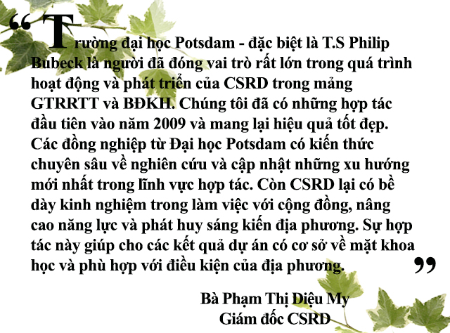 Năm 2017-2018, CSRD cùng với trường đại học Potsdam (Đức) thực hiện dự án “Tăng cường khả năng chống chịu lũ lụt dựa vào hệ sinh thái của vùng ven biển tỉnh Thừa Thiên Huế”. Từ dự án này, CSRD cùng với đối tác tại trường Đại học Potsdam đúc kết các kết quả nổi bật và đưa ra đề xuất cho hoạt động tiếp nối mang tên “Gốc rễ bền chặt, phụ nữ quật cường” tham dự giải Risk Award 2021.