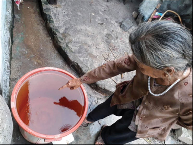 Dù chưa được kiểm định, nhưng bằng mắt thường có thể nhìn thấy rất rõ màu cặn vàng đọng trong đáy các bồn chứa, thành bể, ấm nấu nước và những dụng cụ sinh hoạt khác của người dân.