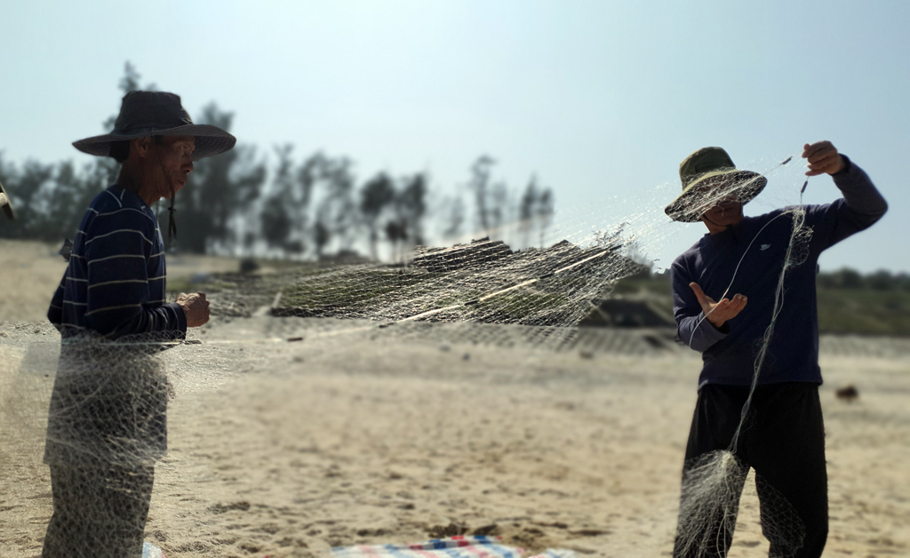 Ngư dân kiểm tra lưới sau khi cập bờ