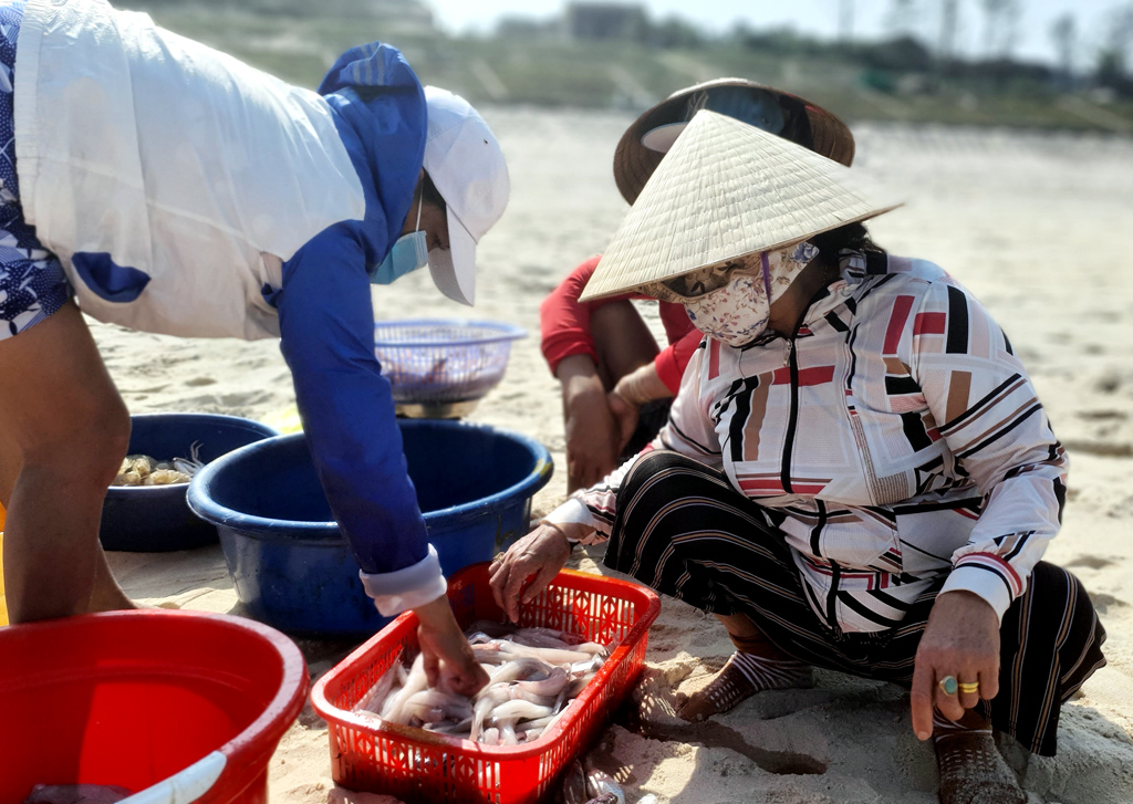 Những người vợ, người mẹ đợi sẵn trên bờ phân loại cá đi bán