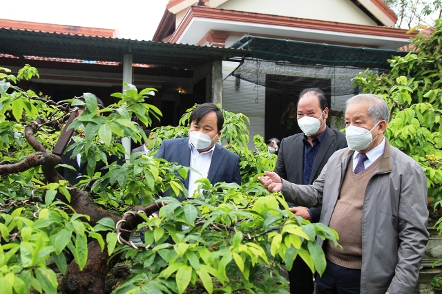 Phó Bí thư Thường trực Tỉnh ủy Phan Ngọc Thọ và lãnh đạo huyện Phú Lộc thăm mô hình trồng mai cảnh trong chậu của người dân