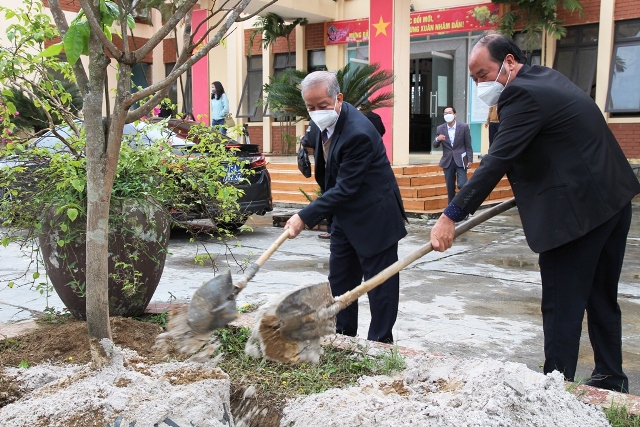Phó Bí thư Thường trực Tỉnh ủy Phan Ngọc Thọ và lãnh đạo huyện Phú Lộc trồng mai tại UBND xã Vinh Hưng