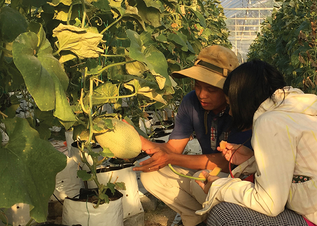 Chủ trang trại dưa lưới Hải Farm giới thiệu công nghệ trồng dưa với khách tham quan. Ảnh: Tuệ Ninh